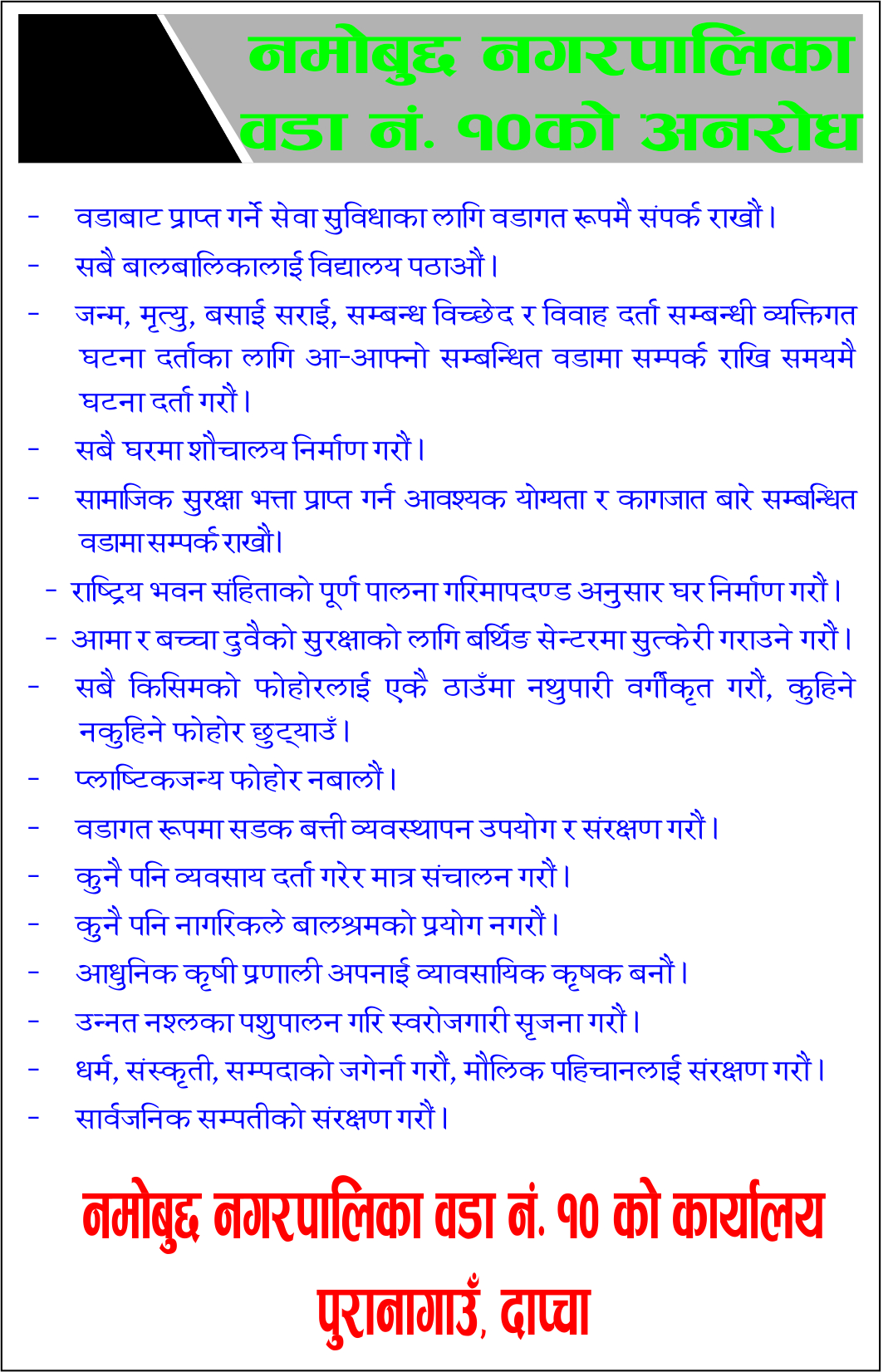कटुवा/ललितपुर बागमती गाउँपालिका वडा नं. ७ मा गठित वडास्तरीय विद्यालय अतिरिक्त क्रियाकलाप समितिको आयोजनामा चौथो वडास्तरीय अतिरिक्त क्रियाकलाप कार्यक्रम श्री जनक माध्यमिक विद्यालय, कटुवा, ललितपुरमा सम्पन्न भएको छ। विद्यार्थीहरूलाई खेलकुदको माध्यमबाट अनुशासन, खेलभावना,... विस्तृतमा