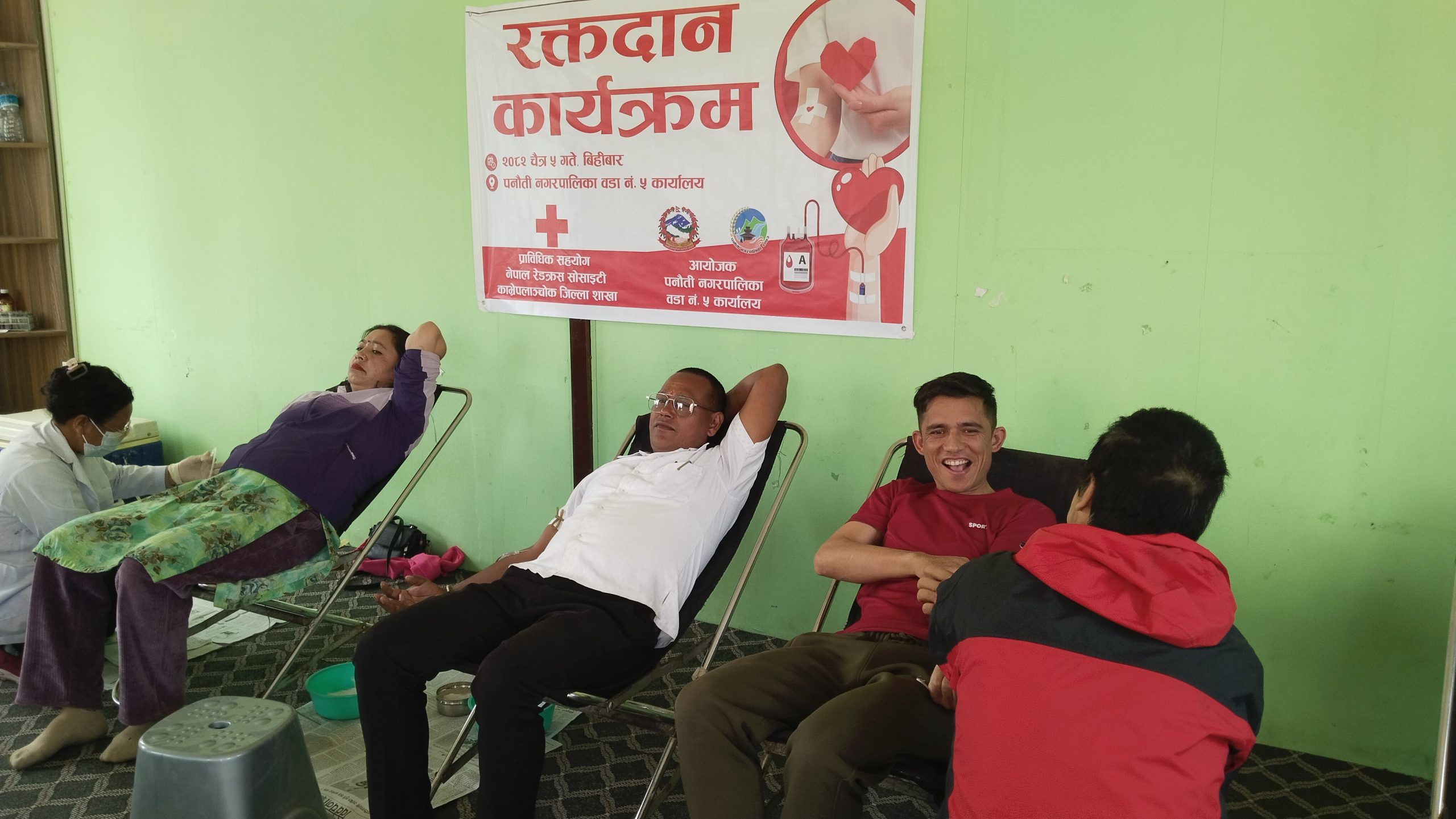 पनौती नगरपालिका वडा नं. ५ कार्यालयको आयोजनामा रक्तदान कार्यक्रम सम्पन्न भएको छ। बिहीबार सम्पन्न उक्त कार्यक्रममा स्थानीयबासी, युवाहरू तथा विभिन्न संघ–संस्थाका प्रतिनिधिहरूको उल्लेखनीय सहभागिता रहेको थियो।